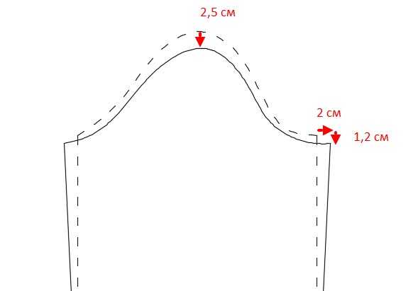 - Высчитываем величину, на которую опустить вершину рукава: спуск плеча 2,5 см минус половина углубления проймы 2,5/2, получаем примерно 1,5 см, абсолютная точность не нужна.