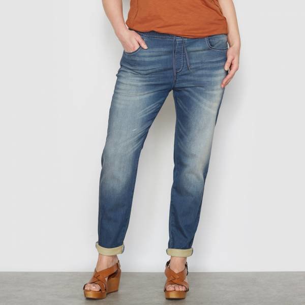 - Джинсы на резинке – могут быть корсетного покроя или спортивного типа с заниженной талией. Это очень удобная модель — резинка не сдавливает так, как это бывает с брюками на пуговицах;